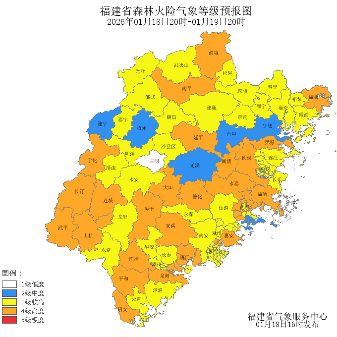 今天晚上到明天白天,宁德市的森林火险气象等级为较高危险(三级),莆田市、南平市、福州市、厦门市、泉州市、漳州市、龙岩市、三明市的森林火险气象等级为高度危险(四级),其中,鼓楼区、台江区、仓山区、马尾区、晋安区、长乐区、连江县、思明区、湖里区、福安市、霞浦县、屏南县、寿宁县、周宁县、柘荣县、荔城区、仙游县、鲤城区、洛江区、泉港区、石狮市、晋江市、南安市、永春县、芗城区、龙文区、漳浦县、云霄县、东山县、华安县、长泰区、新罗区、永定区、永安市、明溪县、清流县、沙县区、泰宁县、邵武市、武夷山市、建瓯市、顺昌县、光泽县、松溪县、政和县的森林火险气象等级为较高危险(三级),福清市、浦城县、罗源县、闽清县、永泰县、海沧区、集美区、同安区、翔安区、福鼎市、城厢区、涵江区、丰泽区、惠安县、安溪县、德化县、龙海市、诏安县、南靖县、平和县、漳平市、长汀县、上杭县、武平县、连城县、宁化县、大田县、延平区、建阳区、闽侯县的森林火险气象等级为高度危险(四级)。