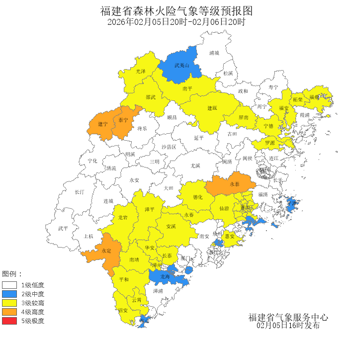 今天晚上到明天白天,莆田市、泉州市、宁德市、龙岩市、漳州市、南平市的森林火险气象等级为较高危险(三级),三明市的森林火险气象等级为高度危险(四级),其中,屏南县、柘荣县、城厢区、涵江区、荔城区、仙游县、鲤城区、福鼎市、福安市、蕉城区、罗源县、德化县、光泽县、建瓯市、邵武市、建阳区、漳平市、新罗区、长泰区、惠安县、安溪县、永春县、芗城区、云霄县、诏安县、南靖县、平和县、华安县的森林火险气象等级为较高危险(三级),永泰县、泰宁县、永定区、建宁县的森林火险气象等级为高度危险(四级)。