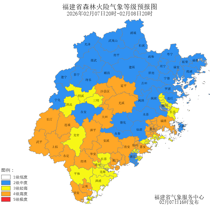 今天晚上到明天白天,福州市的森林火险气象等级为较高危险(三级),南平市、厦门市、莆田市、龙岩市、漳州市、泉州市、三明市的森林火险气象等级为高度危险(四级),其中,清流县、明溪县、新罗区、长泰区、平和县、东山县、漳浦县、龙海市、龙文区、芗城区、石狮市、泉港区、丰泽区、鲤城区、秀屿区、长乐区、三元区、马尾区、晋安区的森林火险气象等级为较高危险(三级),延平区、荔城区、尤溪县、大田县、湖里区、洛江区、连城县、武平县、上杭县、长汀县、漳平市、永定区、海沧区、思明区、华安县、福清市、南靖县、诏安县、集美区、南安市、惠安县、安溪县、同安区、翔安区、城厢区、涵江区、云霄县、沙县区的森林火险气象等级为高度危险(四级)。