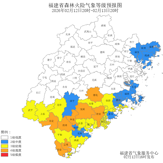 今天晚上到明天白天,厦门市、龙岩市、莆田市的森林火险气象等级为较高危险(三级),泉州市、漳州市的森林火险气象等级为高度危险(四级),其中,翔安区、同安区、集美区、湖里区、海沧区、思明区、石狮市、武平县、上杭县、新罗区、长泰区、平和县、东山县、漳浦县、龙文区、永春县、晋江市、泉港区、洛江区、丰泽区、鲤城区、仙游县、秀屿区的森林火险气象等级为较高危险(三级),南安市、安溪县、德化县、云霄县、华安县、永定区、南靖县、诏安县的森林火险气象等级为高度危险(四级)。
