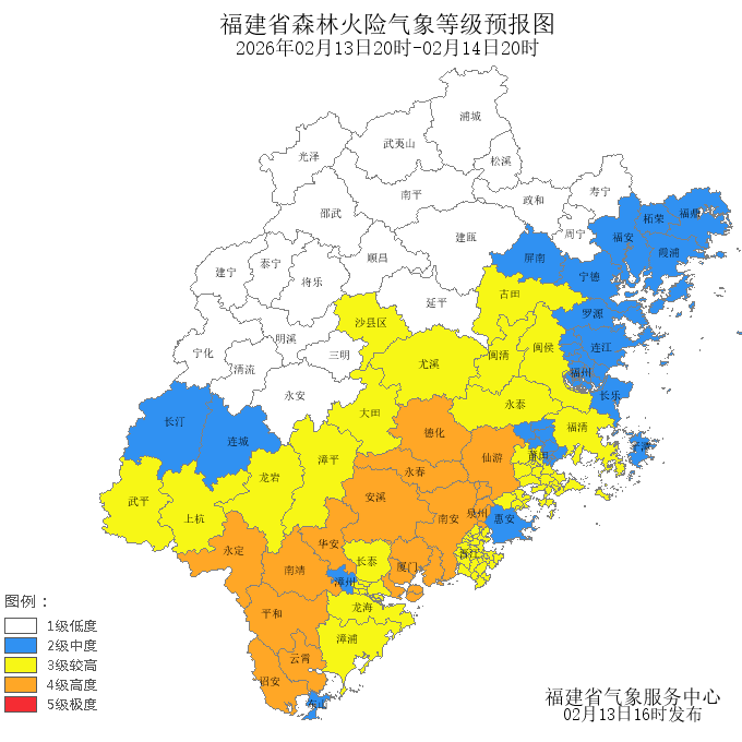 今天晚上到明天白天,龙岩市、莆田市、福州市、三明市的森林火险气象等级为较高危险(三级),厦门市、泉州市、漳州市的森林火险气象等级为高度危险(四级),其中,漳平市、上杭县、武平县、大田县、尤溪县、新罗区、长泰区、漳浦县、龙海市、龙文区、晋江市、石狮市、泉港区、丰泽区、鲤城区、秀屿区、荔城区、城厢区、古田县、永泰县、闽清县、沙县区、福清市、闽侯县的森林火险气象等级为较高危险(三级),安溪县、永春县、湖里区、海沧区、思明区、永定区、洛江区、翔安区、华安县、平和县、南靖县、诏安县、云霄县、同安区、仙游县、集美区、德化县、南安市的森林火险气象等级为高度危险(四级)。