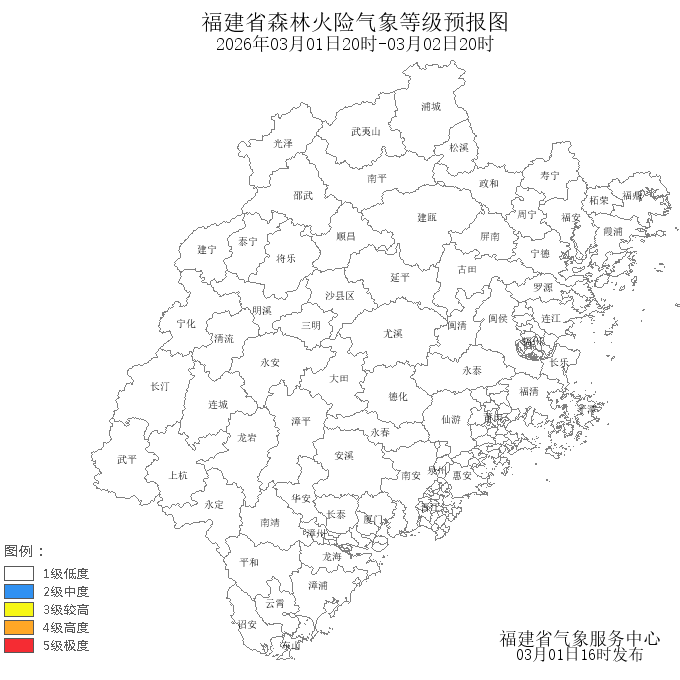 未来1天全省各地森林火险气象等级预报