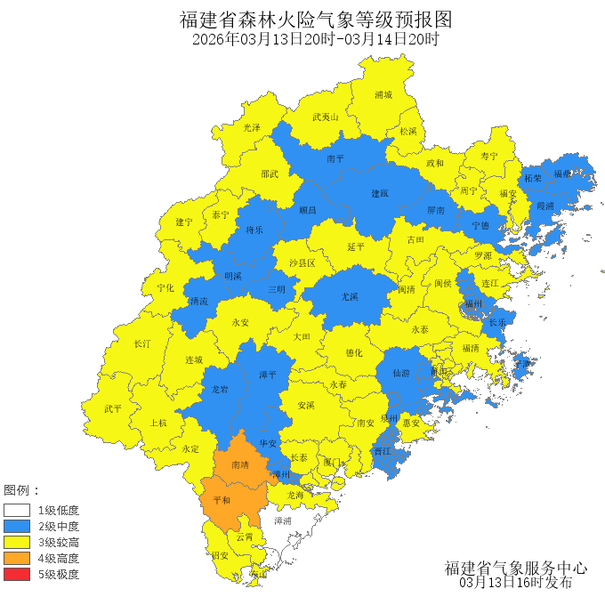今天晚上到明天白天,厦门市、南平市、福州市、宁德市、莆田市、泉州市、漳州市、龙岩市、三明市的森林火险气象等级为较高危险(三级),其中,连江县、罗源县、闽清县、永泰县、思明区、海沧区、湖里区、集美区、同安区、翔安区、福安市、古田县、寿宁县、周宁县、涵江区、荔城区、南安市、惠安县、安溪县、永春县、德化县、龙海市、云霄县、东山县、诏安县、长泰区、永定区、长汀县、上杭县、武平县、连城县、永安市、宁化县、大田县、沙县区、泰宁县、建宁县、延平区、邵武市、武夷山市、浦城县、光泽县、松溪县、政和县、福清市、闽侯县的森林火险气象等级为较高危险(三级),平和县、南靖县的森林火险气象等级为高度危险(四级)。