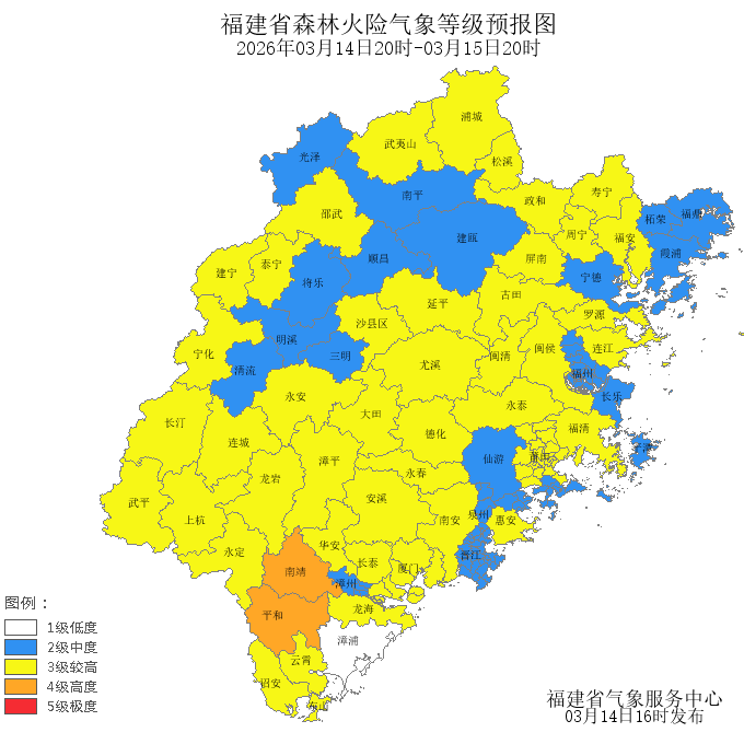 今天晚上到明天白天,厦门市、莆田市、龙岩市、南平市、福州市、宁德市、泉州市、漳州市、三明市的森林火险气象等级为较高危险(三级),其中,连江县、罗源县、闽清县、永泰县、思明区、海沧区、湖里区、集美区、同安区、翔安区、福安市、古田县、屏南县、寿宁县、周宁县、城厢区、涵江区、荔城区、南安市、惠安县、安溪县、永春县、德化县、龙海市、云霄县、东山县、诏安县、华安县、长泰区、新罗区、永定区、漳平市、长汀县、上杭县、武平县、连城县、永安市、宁化县、大田县、尤溪县、沙县区、泰宁县、建宁县、延平区、邵武市、武夷山市、浦城县、松溪县、政和县、福清市、闽侯县的森林火险气象等级为较高危险(三级),南靖县、平和县的森林火险气象等级为高度危险(四级)。