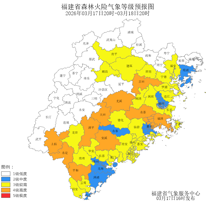 今天晚上到明天白天,泉州市、宁德市、平潭、福州市、厦门市、莆田市、漳州市的森林火险气象等级为较高危险(三级),龙岩市、三明市的森林火险气象等级为高度危险(四级),其中,屏南县、秀屿区、仙游县、鲤城区、丰泽区、洛江区、泉港区、石狮市、晋江市、南安市、惠安县、德化县、云霄县、诏安县、南靖县、华安县、长泰区、新罗区、建阳区、建瓯市、顺昌县、福安市、蕉城区、翔安区、同安区、集美区、海沧区、闽清县、罗源县、连江县、闽侯县、平潭、长乐区的森林火险气象等级为较高危险(三级),平和县、古田县、永泰县、尤溪县、大田县、安溪县、漳平市、永定区、涵江区、福清市、上杭县的森林火险气象等级为高度危险(四级)。