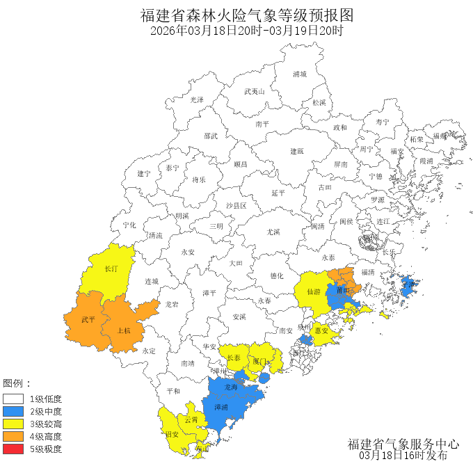今天晚上到明天白天,厦门市、莆田市、漳州市、龙岩市的森林火险气象等级为较高危险(三级),其中,翔安区、同安区、集美区、海沧区、长汀县、长泰区、诏安县、东山县、云霄县、惠安县、仙游县、秀屿区的森林火险气象等级为较高危险(三级),涵江区、上杭县、武平县的森林火险气象等级为高度危险(四级)。