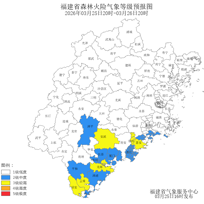 今天晚上到明天白天,泉州市、漳州市的森林火险气象等级为较高危险(三级),其中,龙海市、惠安县、诏安县、洛江区、云霄县、安溪县的森林火险气象等级为较高危险(三级)。