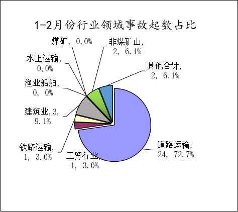 (三)行业领域事故情况。在12个重点统计行业领域中,5个行业领域发生事故。道路运输(24起、22人)、建筑业(共3起、3人,其中:房屋和市政工程1起、1人,公路和水运工程建筑1起、1人,其他建筑业1起、1人)、铁路运输(1起、1人)、工贸(1起、1人)、非煤矿山(2起、2人)。